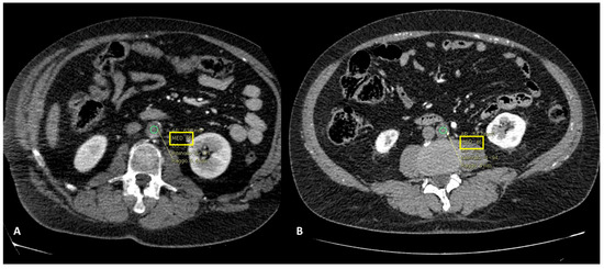 CT angiography, axial planes, arterial phase. In (A), the ROI placed in the aortic thrombus showed a value of 65 HU, while in (B), the value showed was 46 HU. Patient in (A) presented a chronic aortic occlusion while patient in (B) was one of the patients included in our study, affected by primary AAO (male, age 54 y/o).