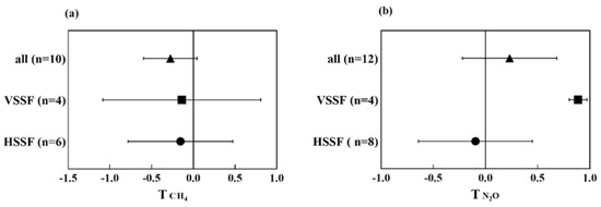 Constructed wetlands can be generally separated into three typical types, i.e., FWS CWs, horizontal subsurface flow (HSSF) CWs, and VSSF CWs, which were distinguished by their structure and water flow direction. The water in both FWS and HSSF CWs flows horizontally, but they differ in water level. A typical FWS CW with emergent macrophytes is a shallow sealed basin or sequence of basins, including 20–30 cm of rooting soil (or the other medium), with a water depth of 20–40 cm. The HSSF CWs commonly consist of gravel or rock beds and are vegetated with wetland plants. The influent wastewater flows through the substrate medium under the surface of the bed in a more or less horizontal path [15]. The VSSF CWs comprise a substrate of gravel or coarse sand planted with macrophytes. The wastewater in VSSF CWs distributes uniformly at the surface of the wetland and then flows vertically to the bottom [16]. Different CWs provide aerobic and/or anaerobic zones (which mainly impact the formation and oxidation of CH4, nitrification, and denitrification) due to differences in water levels and flow patterns. The FWS CWs provide both aerobic and anaerobic zones. The anoxic and anaerobic processes are prevalent in HSSF CWs and relatively fewer aerobic zones appeared in VSSF CWs [15]. The various CWs provide different conditions to impact the processes of pollutants’ migration and transportation in CWs, consequently affecting GHG emission. Based on the meta-analysis, the HSSF and VSSF CWs emit less CH4 than FWS CWs (Figure 2a), but there was no significant difference between HSSF and VSSF CWs (t-test, p > 0.05). The HSSF CWs decrease the N2O emission as compared to VSSF and FWS CWs, and a statistically significant difference (t-test, p < 0.05) was observed between HSSF and VSSF CWs (Figure 2b).