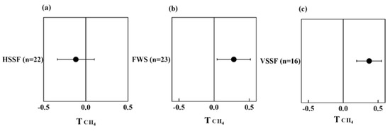 Effect on T index of CH4 emission from different types of vegetated CWs, i.e., HSSF (a), FWS (b), and VSSF (c), compared to unvegetated CWs.