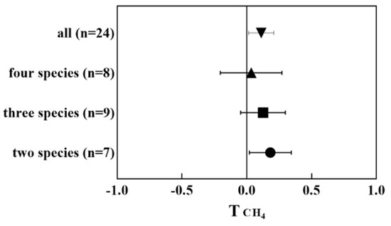 Plant species richness also impacts CH4 emission from CWs. Meta-analysis shows that, irrespective of the number of plant species, polyculture CWs stimulate the CH4 emission compared to monoculture CWs (Figure 5) and there is no significant difference among the different combinations of various species (one-way ANOVA, p > 0.05). Higher amounts of methanogens and lower amounts of methanotrophs were observed in polyculture systems [53,54,55], which can partially explain the higher CH4 in polyculture systems since methanogens and methanotrophs and their activities play a dominant role in CH4 production and consumption in CWs. Notably, although studies support the emission of CH4 being positively related to methanogen numbers in polyculture CWs, Zhang et al. [47] found a negative correlation between CH4 emission and methanogen numbers and activity in polyculture CW microcosms, implying that plant tissues may also emit a certain amount of CH4 in aerobic conditions.