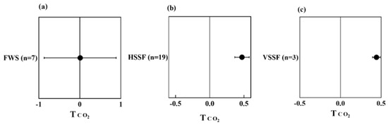 Effect on T index of CO2 emission from different types of vegetated CWs, i.e., FWS (a), HSSF (b), and VSSF (c), compared to unvegetated CWs.