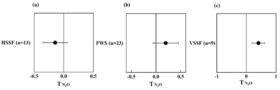 Effect on T index of N2O emission from different types of vegetated CWs, i.e., HSSF (a), FWS (b), and VSSF (c), compared to unvegetated CWs.