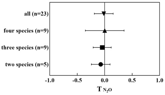 Effect on T index of N2O emission from monoculture CWs compared to polyculture CWs (two, three, and four species).