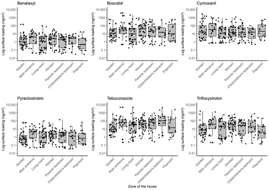 The distribution of pesticide surface loadings by location in the house and garden is shown in Figure 1. The highest medians of surface loadings were found in the front entrance for all pesticides except tebuconazole, for which the highest median was found in a child’s bedroom. The lowest medians of surface loadings were found outside for pyraclostrobin and tebuconazole, in the living room for boscalid and cymoxanil, and in a playroom for benalaxyl and trifloxystrobin.