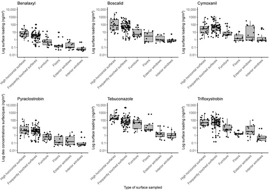 Figure 2 shows the distribution of pesticide surface loadings according to the type of surfaces sampled inside the home. For all pesticides, the lowest median surface loadings were found on interior windowpanes and the highest surface loadings were found for overhead surfaces, except for cymoxanil. The highest median cymoxanil concentrations were found on frequently touched objects (handled objects, switches, door handles, etc.)