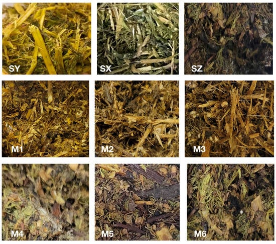The sensory changes of mixed silage after the cans were opened. Note: SY-Rapeseed silage; SX-Alfalfa silage; SZ-M. spicatum silage; M1-Rapeseed × Alfalfa (3:7); M2-Rapeseed × Alfalfa (5:5); M3- Rapeseed × Alfalfa (7:3); M4-Rapeseed × M. spicatum (3:7); M5-Rapeseed × M. spicatum (3:7); M6-Rapeseed × M. spicatum (7:3). The same below.