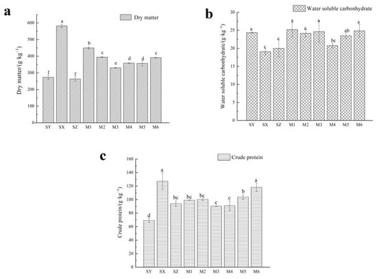 Figure 2c shows that the content of CP in M1, M2 and M3 was 24.66, 30.97 and 21.07 g·kg−1 DM higher than that in SY, respectively. The content of CP reached 118.20 g·kg−1 DM when rapeseed and M. spicatum were mixed at 7:3 (M6), which was significantly higher than those of SY and SZ, and the rapeseed and alfalfa mixed silage groups (p < 0.05).