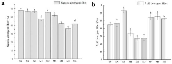 As shown in Figure 3a, the contents of NDF of M1 and M3 in the mixed rapeseed and alfalfa silage decreased to 47.63% and 51.80%. Compared with SY, the content of NDF of rapeseed silage with the addition of M. spicatum (M4, M5 and M6) decreased by 15.50%, 21.58% and 15.90%, respectively.