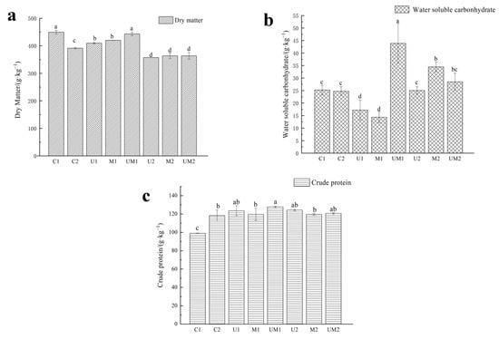 As shown in Figure 4c, the content of CP of MU1 was significantly higher than that of the other treatments (p < 0.05), which was 28.76 g·kg−1 DM higher than that of C1. The CP content of UM2 and U2 slightly increased compared with that of C1, but there was no significant difference between the two treatments (p > 0.05).