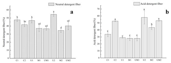 As shown in Figure 5a, the content of NDF of M1 and UM1 decreased by 10.45% and 10.88% compared with that in C1 (47.63%), respectively. The content in U2 was significantly higher than that of C2 (54.48% and 41.73%) (p < 0.05).