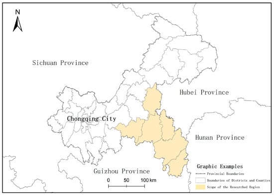 The Wuling Mountains are located in the southeastern part of Chongqing City. In this study, the authors select six districts and counties (autonomous counties), which are the most representative of Wuling Mountains (Figure 1), as the regions to be studied, namely Qianjiang District, Wulong District, Shizhu County, Xiushan County, Qiuyang County, and Pengshui County. They cover a total area of 19,800 km2 and are within the scope of east longitude 107°14′–110°11′ and north latitude 29°39′–32°13′. The whole region is characterized by abundant natural and ecological resources and good environmental status. The Overall Planning of the Space of National Land of Chongqing City (2021–2035) clearly indicates that in the future the integrative development of culture and tourism will be the focus of work. This region will be built into a new benchmark for the integrative development of culture and tourism and serve as an important tourism development region of Chongqing City.