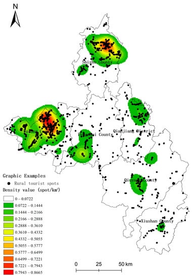 If the result of kernel density analysis (Figure 2) is taken into consideration, it could be discovered that the distribution of rural tourist spots within the researched region demonstrated multi-kernel and closely grouped distribution features. The areas with high-density distribution were mainly located in the central part of Wulong County and the northern part of Shizhu County and involved scenic spots like the Xiannv Mountain National Forest Park of Wulong District and Huangshui National Forest Park of Shizhu County, which had very good natural and ecological conditions. In addition, distribution features of sub-high density were observed in the southeastern part of Pengshui County, the northern part of Qianjiang District, and the central parts of Qiuyang County and Xiushan County. The distribution of rural tourist spots in the remaining areas was relatively regular.