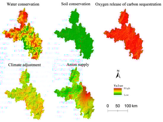 The results (Figure 3) reveal that in 2019 there was a drastic difference between the spatial distribution/layout and the ecosystem regulation services within the scope of the researched region. As far as the different types of ecosystem regulation services were concerned, there were many high-value areas in water conservation service, which were mainly located in the northern and western parts of the researched region that involved the watershed of the Yangtze River and its branches. There were a few high-value areas scattered in the southeastern part; no obvious rules could be observed in the overall distribution of the soil conservation service. The researched region mainly had the landforms of a mountainous area, and there was a high risk of soil erosion. For this reason, there were few high-value areas of soil erosion, and the distribution of them was decentralized; the oxygen supply and the ecological system were subject to similar spatial distribution rules. As the forest ecosystems that had remarkable functions of carbon sequestration and oxygen release within the researched region were scattered extensively, the distribution of high-value areas of the services of carbon sequestration and oxygen release was also extensive; the distribution of high-value areas of climate adjustment service was generally decentralized. For this reason, there were few high-value areas in the northern part of the researched region, and in the southern and central parts, the distribution of high-value areas was dense; the high-value areas of the anion supply service were mainly located in the eastern part of the researched region, and in the central part they were scattered very extensively. That was to say, there were many more high-value areas in the eastern part than in the central part.