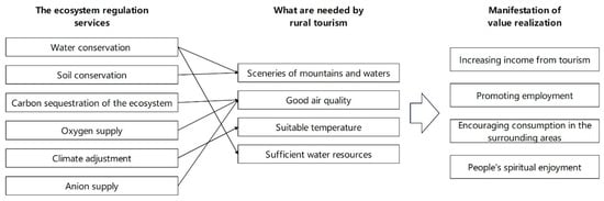 For this reason, in view of the supply–demand relationship of industrial development (Figure 4), high-quality regulation services (one of the ecological products) provided by the ecosystem to human beings are closely relevant to the different factors needed in the development and operation of rural tourism and play a significant supportive role in the development of rural tourism. Meanwhile, the development of rural tourism will increase the income of people who work in the tourism industry in the relevant areas, create jobs, encourage consumption in the surrounding areas, effectively facilitate the implementation of the rural revitalization strategy, and, more importantly, enable the broad masses to get spiritual nourishment, enjoy the fruits of ecological civilization construction, and realize their social values, which further indicates that rural tourism is one of the important ways for the value realization of ecosystem services (ecological products) and for the support of ecosystem services for rural tourism development and green and sustainable development. For example, according to the statistics of the Culture and Tourism Development Committee of Wulong District, Wulong District, as one of the areas in the regions of study where rural tourism is densely distributed, received a total of 12,000,500 rural tourism tourists and realized consolidated income of RMB 2407 million in 2020, and Shizhu County clearly stated in its 14th Five-year Plan for Agricultural and Rural Modernization (2021–2025) that it will receive 5 million pastime agriculture tourism and rural tourism tourists in 2025 (it received 4.03 million in 2020), and it expects to raise the income from the relevant aspects to RMB 3 billion by that time.