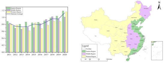 First, during 2011–2020, the average green innovation efficiency in the central and western regions irregularly fluctuated compared with the national average; in the eastern region, the average green innovation efficiency was higher than the national average. Thus, we found that development of regional green innovation was uneven, being strong in the east and weak in the west. This is roughly the same as the findings of Wang (2019) [], which indicates that green innovation efficiency is closely related to regional development, and the eastern region is leading in terms of economic foundation, institutional environment or scientific and technological R&D, and has obvious advantages in green innovation development. The central and western regions are mainly characterized by high-pollution and high-energy-consumption industries, and their green innovation foundation is weaker, so their green innovation development is in the initial stage. This finding is similar to that of Zhang (2022) [], who argued that the eastern region in China is consistently leading in innovation, whereas the central and western regions differ in terms of resource endowment, green innovation investment, and geographic location, so they face different problems and have different advantages when attempting to increase the efficiency of green innovation.