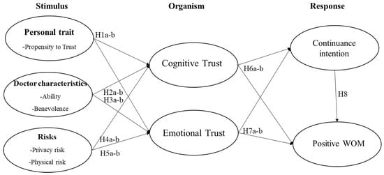 The S-O-R framework was proposed by [,]. This framework suggests that the external environment and personal traits can act as external and internal stimuli that trigger an individual’s cognitive process and emotional state. Such an organismic experience then results in a series of behavioral responses. The S-O-R framework has been widely applied in academic fields, such as retailing, hospitality, online shopping, and social commerce [,,,]. For instance, following the S-O-R framework, Cho et al. [] suggested that autonomy interactivity, self-expression, and visual aesthetics as stimuli can affect the technological and aesthetic aspects of user satisfaction and pleasure (O), which subsequently impact product attachment (R) in e-commerce. Brewer and Sebby [] investigated the effects of menu appeal, menu informativeness, and perception of COVID-19 (S) on consumer purchase intention (R) through the desire for food and the perceived convenience of online food ordering (O). In the m-Health context, continuance intention (R) can be affected by health empowerment (O) and gratification (O) with perceived affordances (S) []. Information, the system, and the service quality (S) affect user engagement, satisfaction, and the love of the app (O), leading to continuance intention, WOM, and stickiness intention (R) with regard to a mobile fitness application []. Chudhery et al. [] explores the ways in which the technology-based m-Health characteristics (S) affect initial trust and satisfaction (O), resulting in behavioral intention to use the m-Health services (R). Unlike those studies, this study adopts the S-O-R framework to first examine how the trust from patients and doctors (S) affects two different types of trust in m-Health apps/platforms (O) with regard to continuance intention and positive WOM (R) in online medical consultations. Accordingly, this study applies the S-O-R model to understand m-Health service users’ post-adoption behavioral intentions by simultaneously considering the internal and external stimuli. More specifically, we regard personal traits as the internal stimuli and doctor characteristics and the physical and psychological risks as the external stimuli. The users’ cognitive trust and emotional trust are regarded as the organism. Finally, the users’ post-adoption behavioral intentions (i.e., continuance intention and positive WOM) are the responses in the model, as shown in Figure 1.