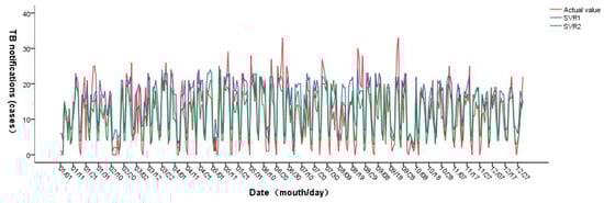 To sum up, considering the nonlinear relation between influencing factors and the incidence of tuberculosis, this research intends to analyze the tuberculosis notification data from the period of 2010–2021 from Changde City, Hunan province as well as the meteorological and air pollution data. It also intends to describe the occurrence characteristics of the tuberculosis and epidemic trend and explore the correlation between tuberculosis disease and meteorological factors and air pollutants. A machine learning algorithm (support vector regression, random forest regression and BP neural network) was used to construct the daily incidence prediction model of tuberculosis, based on meteorological factors and air pollutants. The mean absolute error (MAE), root mean square error (RMSE) and mean absolute percentage error (MAPE) were used to evaluate the prediction effect of each model; this was conducted to explore the best prediction model for tuberculosis and provide a basis for the prediction and early warning model construction of infectious diseases.