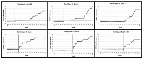 In addition, all data points during and after intervention (100%) fell above the CL, the stable baselines observed pre-intervention. The higher scores were also maintained during the follow-up, with an additional improvement reported at week 21 in the second goal of the first participant. These results indicated significant changes in the performance scores in all selected goals, relative to the CL, which may support the effectiveness of the PREP intervention.