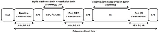 After the completion of the instrumentation, participants rested quietly in a supine position for 20 min followed by the experimental measurements, which were carried out three times throughout the test (e.g., Baseline, Post RIPC/SHAM, and Post IRI). The measurement started with cutaneous blood flow that was continuously monitored throughout the protocol but analyzed at a specific time point followed by HRV measurement for 5 min. Subsequently, blood pressure and pulse rate were measured using a digital sphygmomanometer (BP742N, OMRON Corporation, Kyoto, JAPAN) together with the cold pressor test (CPT) to determine sympathetic reactivity. CPT was carried out by the immersion of participants’ right hand in cold water (at 4–5 °C) for 3 min during which blood pressure and pulse rate were measured at the end of the first and third minutes.
