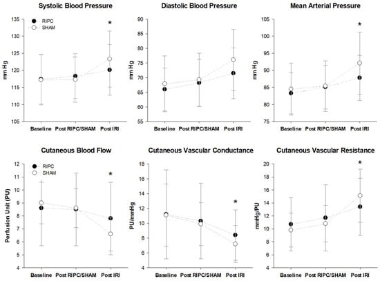 The present results showed the significant inhibitory effects of RIPC on the reduction in CBF; in agreement with previous findings, these effects mitigated the IRI-related impairment in CVC and CVR. Kraemer et al. (2011) reported that a single bout of RIPC significantly increased blood flow and tissue oxygen saturation during the reperfusion phase in healthy young men []. Moreover, Kharbanda et al. (2002) showed that blood flow in response to acetylcholine after IRI alone was decreased, whereas a single bout of RIPC suppressed this reduction in healthy humans []. These acute preconditioning effects on vascular function, such as reduced coronary resistance and increased cerebral blood flow, have also been reported in animal studies [,,]. Moreover, significantly suppressed elevation in SBP and MAP in RIPC (Figure 2), which might be explained by the augmented cutaneous vasodilation, supports previous findings [] and implies therapeutic potential for blood pressure management [].