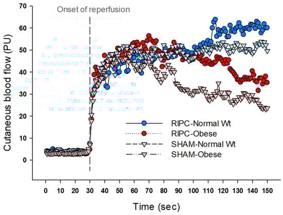Both obesity and IRI are hypoxic and share similar inflammatory profiles including excessive production of reactive oxygen species and inflammatory cytokines [,]. Therefore, due to increased susceptibility to ischemic injury, we expected a greater degree of IRI together with reduced RIPC-induced preservation of vascular function in obese individuals compared with the normal-weight participants. Contrary to our expectations and previous results from the animal model [,], the present results showed the positive effects of RIPC on vascular and autonomic functions in obese participants after IRI, although the obese individuals showed a lesser degree of CBF recovery and maintenance over time compared with the normal-weight individuals in the first 2 min of reperfusion (Figure 3).
