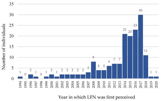 Among the participants reporting LFN perceptions (n = 190), 93% reported a date on which they started perceiving the LFN (n = 177). Dates ranged between 1994 and 2020 with an exponentially growing pattern (see Figure 1) and a median of 2015 (M: 2013.01, SD: 5.13). The pattern shows a drop in 2018, however, most data (n = 164) was collected in 2018. Explicitly, 66 participants (35%) attributed the appearance of LFN to a specific day (with 26 reporting the first of the month), 63 (33%) to a specific month, 37 (20%) to a specific year, and 12 could only approximate the first perception to a year. Regarding the occurrence of LFN at a specific month, no clear pattern was observed (see Figure S1). However, significantly more (z = −2.20 p = 0.03) participants reported the first occurrence in autumn/winter (n = 77, 60%) compared to spring/summer (n = 52, 40%), as also depicted in Figures S1 and S2.