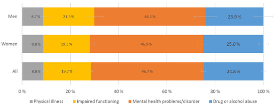 As detailed in Figure 1, the most common type of illness in the care-receiver was mental health problems or disorders (46.7%), followed by drug or alcohol use (24.8%), impaired functioning (19.7%) and physical illness (8.8%). This pattern was similar for male and female students.