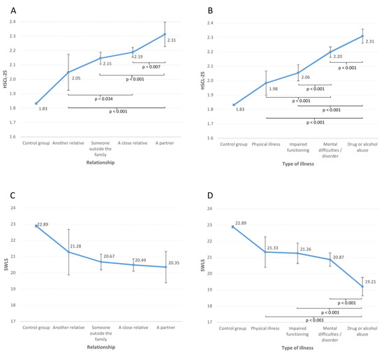 Mental health problems (HSCL-25) and life satisfaction (SWLS) by type of relationship between YACs and care-receiver (A,C) and type of illness in care-receiver (B,D).