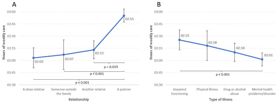 YACs reported spending on average 2:12 h per day on caring. In terms of the relationship with the care-receiver, caring for a partner was associated with significantly more hours of daily care (2:55 h per day), compared with 2:03–2:13 h per day for the other categories (see Figure 3A for details).