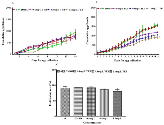 Cumulative egg production of zebrafish in 14 days before exposure (A) and 21 days (B) during exposure (3 pairs of fish per replicate, 3 replicates). (C) Fertilization rates of F1 embryos from the parents exposed to TEB (200 larvae per replicate, 4 replicates). Data are expressed as the mean ± SEM of three independent experiments. Asterisks in the figures were regarded as statistical differences between the exposure groups and control group (Tukey: * p < 0.05).