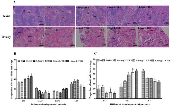 Effects of TEB on the gonadal development of zebrafish. (A) sections of ovary and testis stained by H&E (mean ± SEM, n = 6). Bars represent 50 µm (900×) and 500 µm (90×). Percentages of primary oocytes (PO), cortical oocytes (CAO), early vitellogenic oocytes (EVO), late/mature oocytes (LO), spermatogonia (SG), spermatocytes (SC), and spermatids (ST) were shown in (B,C). Asterisks in the figures were regarded as statistical differences between the exposure groups and control group (Tukey: * p < 0.05).