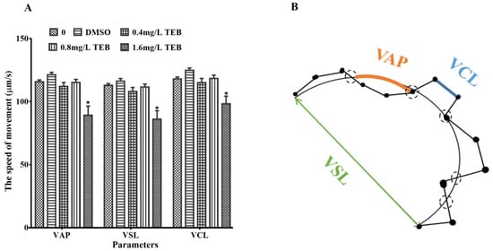 It was shown that the three motor parameters of VCL, VSL, and VAP have a stronger association with the rate of fertilization compared with the other parameters. The three motor parameters were not dramatically affected in the solvent control group compared to the blank control. Nevertheless, the three indicators of sperm swimming velocity (VAP, VSL, and VCL) were remarkably reduced by 19.9%, 21.6%, and 13.7% in the 1.6 mg/L TEB group, respectively (p < 0.05) (Figure 3). And VAP, VSL, and VCL of sperms in other exposure groups were not notably altered.