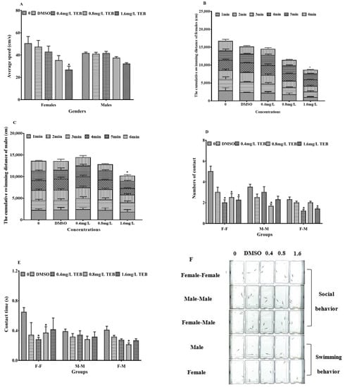 (A) Mean swimming speed of female and male zebrafish after exposure for 21 days (mean ± SEM, n = 16). Cumulative swimming distance of female (B) and male (C) zebrafish after exposure to TEB for 21 days (mean ± SEM, n = 16). Social behaviors of females and males (mean ± SEM, n = 16). (D) numbers of contacts, (E) contact time, F-F, female and female; M-M, male and male; F-M, female and male. (F) Real-time pictures of behavior detection. Asterisks in the figures were regarded as statistical differences between the exposure groups and control group (Tukey: * p < 0.05).