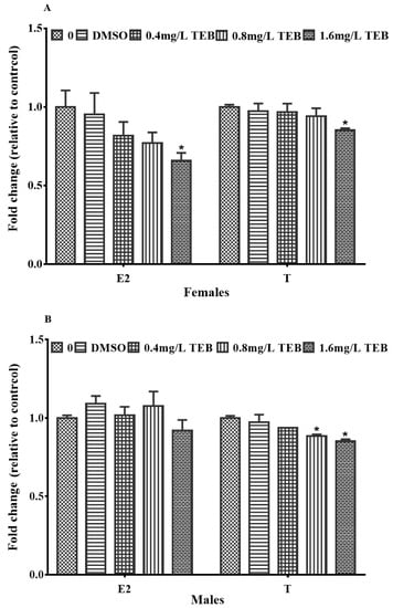 Influence of TEB on the levels of E2 and T in female (A) and male (B) zebrafish (mean ± SEM, five fish per replicate, 4 replicates). Asterisks in the figures were regarded as statistical differences between the exposure groups and control group (Tukey: * p < 0.05).
