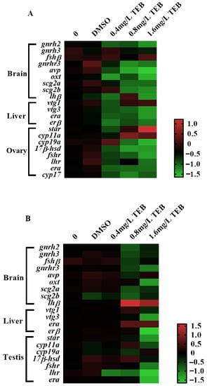 The sex hormone levels in both females and males were altered after exposure to TEB. In females, the plasma E2 and T levels were observably reduced by 34.1% and 14.7% in the 1.6 mg/L TEB group (Figure 5A). In males, the concentration of T was notably decreased by 11.6% and 14.7% after exposure to 0.8 mg/L and 1.6 mg/L TEB (Figure 5B). However, the E2 level was not evidently affected.