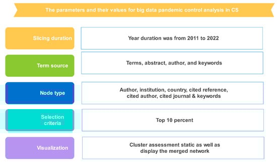 The main analytical processes were used to visually assess and collect the data through the CS (6.1.R6). First, a project proposal for a project titled “Big data technologies to control pandemic” was created using the WOS’ exhaustive list and quoted a straightforward CS text tutorial. The authors used only WOSCC due to the CS software’s limitation of only being able to use one kind of research collection at one time; the authors tried to use other research collections along with WOSCC, but CS could not visualize the data. The second step was to clarify the parameters, which included the date range (from 2011 to 2022, a 1-year slice for co-authorship as well as for the co-accordance evaluation), visualization (displaying the merged networks), specific selection criteria (top 10 percent), node form (writer, institution, region, credible source cited, cited writer, journal, and keywords), pruning (including the pathfinder as well as the slicing network), and specific selection process (top 10 percent). Figure 1 shows the CS parameter selection to visualize the data derived from WOS.