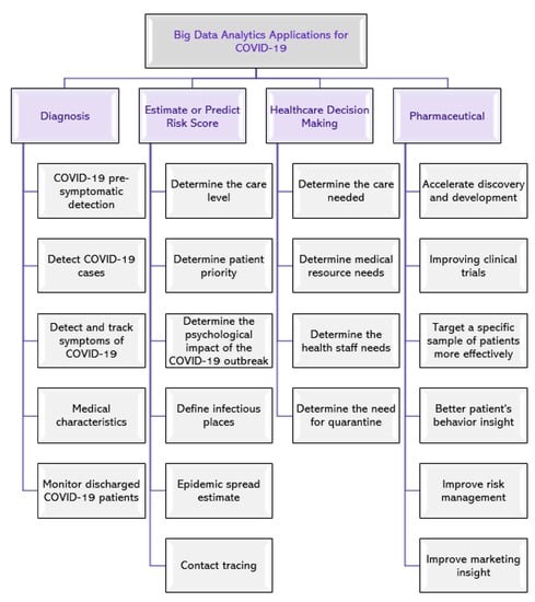 As the COVID-19 epidemic swept the globe, it generated a massive and ever-expanding trove of data. Big data analytics approaches may be used with this information to aid in a variety of settings, such as diagnostics; risk score estimation and prediction; healthcare decision-making; and the pharmaceutical business. Figure 2 shows several possible uses of big data in COVID-19 [].