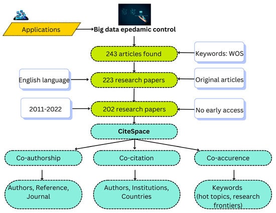 CiteSpace provides a number of features that support the analysis of scientific literature, including identification of key researchers, institutions, and journals in a particular field, as well as analysis of co-citation networks to identify influential articles and intellectual bases of research fields. CiteSpace can be used to identify trends and patterns in scientific research, to track the development of a particular field, and to identify areas for future research. The software is flexible and can be applied to a wide range of scientific and technological fields. For pandemic control using big data, the following is the extensive context for the whole investigation, as shown in Figure 3.