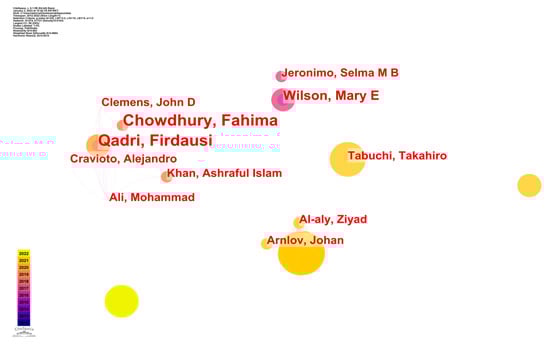 Figure 4 represents the scholarly efforts of several writers working together to generate a single piece of work by deciding on an appropriate threshold and an appropriate analytical unit. The size of a node represents the sum of all articles written by its writers. Links between writers are thicker when they work together. The colors represent the publishing year, ranging from blue (oldest papers) to yellow (most recent papers). As seen in Figure 4, the authors of at least one article were graded. The most renowned scholarly team under Qadri Firdausi’s [] supervision is a large sub-network with six nodes, while Chowdhury Fahima [], Cravioto Alejandro [], and Khan Ashraful Islam [] were also incorporated in his study team. In one of their papers [], oral cholera vaccination was described by Qadri and colleagues as both feasible and efficacious in an urban endemic context in Bangladesh. An annual epidemic of cholera is a fact of life in Bangladesh. The decision on whether or not a low-cost, oral killed whole-cell cholera vaccine is used to manage the illness in a public health environment relies on the vaccine’s acceptability and effectiveness in that context. Anti-harming efficacy among vaccinated people was 37% overall. Dhaka, Bangladesh is home to several urban slum communities, and another piece of research [] was undertaken there. One third of the population lived in “better” WASH homes, and the occupants had a 47% lower risk of severe cholera. In terms of severity, cholera risk was most strongly connected with poor water quality and limited access to clean water. Living in a household with “superior” WASH facilities was associated with lower mortality across all age categories. Dhaka, Bangladesh, is home to several urban slum communities, where our research took place. The onset of the first severe cholera episode during the follow-up period was the main end point. Twelve hospitals in the research region participated in cholera monitoring.