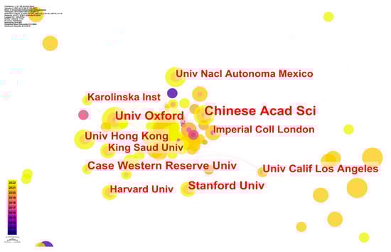 The institutions that had published four or more articles are designated in Figure 5. Three large, dispersed subnetworks and a few scattered institutions have propped up the whole cooperative network. The Chinese Academy of Sciences worked with many institutions (15 universities), which are not shown in the figure. The University of Oxford created publication links with the Karolinska Institute and worked with up to 11 institutions. Stanford University collaborated with 10 institutions in total, including the University of California, Los Angeles.