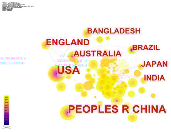 The top five most productive nations, according by the number of original papers produced, are shown in descending order in Table 5, for convenience in interpreting Figure 6. Of the total number of papers, the United States contributed 83, followed by those from the People’s Republic of China (78), England (35), Australia (26), and Japan (22).