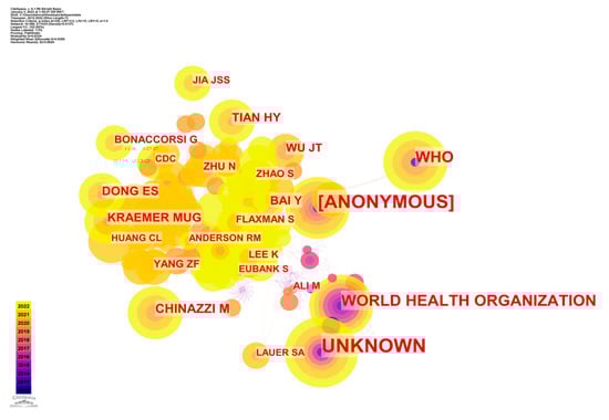 Each node in Figure 9 represents one author, and the line connecting any two writers indicates a co-citation relationship between them. Those who had seven or more references attributed to them are noted in Figure 9. The largest nodes are an unknown individual, an anonymous researcher, a researcher linked with the World Health Organization, and WHO.