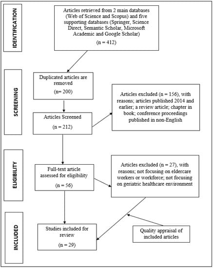 Considering that both Scopus and Web of Science are robust and comprise over 256 research disciplines, inclusive of business and social science studies, the current study’s review procedures were undertaken utilizing these two major databases. In particular, Scopus indexes 763 journals, and Web of Science (Social Science Citation Indexed) indexes 108 journals related to organisational behaviour and human resource management, geriatrics and gerontology, social sciences, and care planning. A previous study [] proposed that researchers should perform their searches using a high number of databases for the purpose of boosting their chances of identifying relevant publications. Therefore, the current study performed manual searches on other reputable databases, including Science Direct, Microsoft Academic, Springer, Google Scholar, and Semantic Scholar, as these are reputable databases that include business management-related articles.