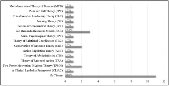 Within the reviewed papers (see Figure 2), 11 (38%) did not involve theories. Frameworks and theories were published in either single or integrated forms. Notably, 11% of the articles employed the job demand–resources model (JD-R), while 7% utilized the conservation of resources theory (CRT) and the two-factor motivation–hygiene theory (TFMH). Due to the obvious lack of theories and frameworks, independent variables were chosen without a theoretical or framework support.