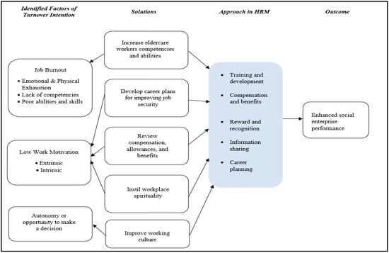 Elderly care social enterprises must first improve their managerial skills to enhance eldercare workers’ competence. Ineffective management instigated turnover intention in the form of inappropriate work shifts, heavy workloads, and low organisational support [,,,,,]. Such complexities could result in physical and emotional exhaustion. Consequently, the HR approaches in eldercare social enterprises could be effectively planned and revised through a top management commitment and organisational efforts [,]. In addition to increasing HR management, the management must monitor employees’ competencies and skill sets to assure the quality of eldercare social enterprises and employees’ job performance [,,]. A high work performance demonstrates job satisfaction, which subsequently elevates employee retention.