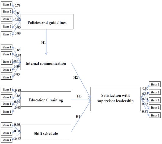 Table 4 presents the overall revised model. Satisfaction with the policies and guidelines was positively associated with satisfaction with internal communication (B = 1.07, p < 0.001) (H1 was supported). Furthermore, the regression coefficient of the relationship between satisfaction with the policies and guidelines on satisfaction and the work environment was positive (B = 1.07, p < 0.001) (H2 was supported). The regression coefficient of the relationships between satisfaction with internal communication on satisfaction and supervisor leadership was positive (B = 0.40, p < 0.001) (H3 was supported). The regression coefficient of the relationship between satisfaction with the work environment on satisfaction and supervisor leadership was not significant (B = −0.40, p > 0.05) (H4 was not supported). The regression coefficient of the relationship between satisfaction with educational training on satisfaction and supervisor leadership was positive (B = 0.23, p < 0.01) (H5 was supported). The regression coefficient of the relationship between satisfaction with shift schedules on satisfaction and supervisor leadership was positive (B = 0.40, p < 0.001) (H6 was supported). The regression coefficient of the relationship between satisfaction with the salary and benefits as well as supervisor leadership was not significant (B = −0.09, p > 0.05) (H7 was not supported).