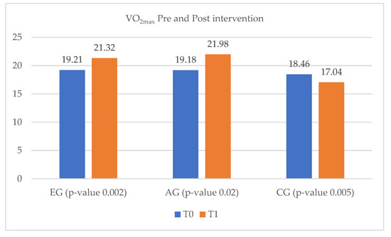 The evaluation of exercise capacity, measured by VO2max at T0 and T1, shows a statistically significant difference between the pre- and post-intervention groups’ values. Thus, an improvement in exercise capacity can be observed in both EG and AG, from 19.21 mL/kg/min and 19.18 mL/kg/min, to 21.32 mL/kg/min and 21.98 mL/kg/min, respectively. On the other hand, in the CG the VO2max decreased from 18.46 mL/kg/min to 17.04 mL/kg/min (Figure 1).