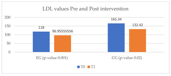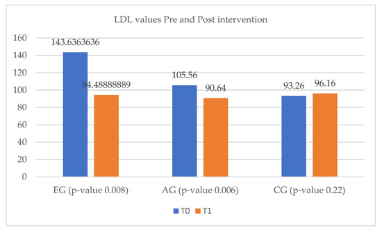 According to Figure 2, between T0 and T1, LDL-cholesterol levels decreased in both experimental and ambulatory groups. The LDL-cholesterol improvement was much more pronounced in the EG, the decrease being approximately 30% of the initial value. The CG did not show significant changes between T0 and T1 (Figure 2).