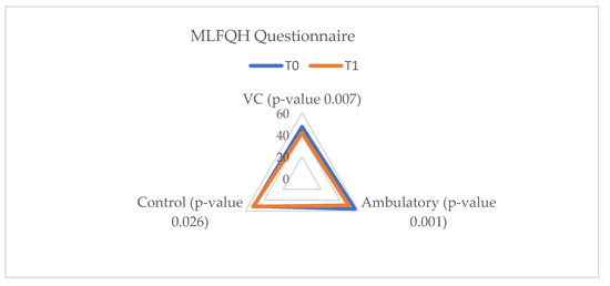 In terms of quality of life, in the vCare and ambulatory groups an improvement was observed, along with a decrease in anxiety and depression levels. Patients enrolled in the EG and AG showed significantly improved results in both the MLFQH questionnaire and on the HAD scale. Unlike them, in the CG no improvement in quality of life and anxiety levels was observed, but the severity of the depression level increased (p-value = 0.4) (Figure 3, Figure 4 and Figure 5).