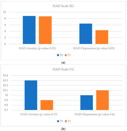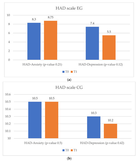 HAD scale results for IHD EG and CG at T0 and T1. (a) HAD scale EG. (b) HAD scale CG. HAD = hospital anxiety and depression scale; IHD = ischemic heart disease; EG = experimental group; CG = control group; T0 = before the rehabilitation period; T1 = after the rehabilitation period.